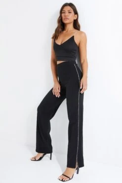 Black Embellished Trim Palazzo Trousers